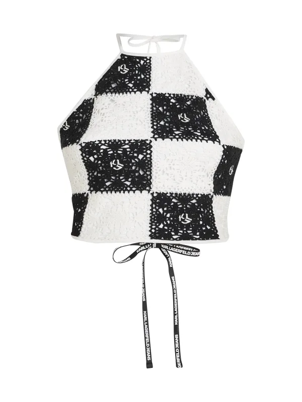 Design: Gevoerde zoom/rand; Materiaal: Knitwear; Motief: Geruit; Soort bandjes: Haltermodel; Details: Borduursels, Mesh, Backless; Extra's: Verstelbare bandjes, All-over patroon, Met textuur; Pasvorm: Aansluitende pasvorm; Armlengte: Mouwloos; Lengte: Korte pasvorm