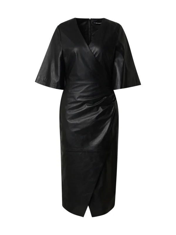 Design: Gevoerde zoom/rand, Beenopening, Rechte zoom, Rug rits; Type sluiting: Ritssluiting; Materiaal: Leer; Halstype: Wikkeltop; Motief: Effen; Details: Wikkel design; Extra's: Label borduurwerk, Op staal naden, Gladde stof, Stevige stof; Lengte: Knielengte; Snit: Figuur omarmend; Pasvorm: Normale pasvorm; Armlengte: Halve mouw