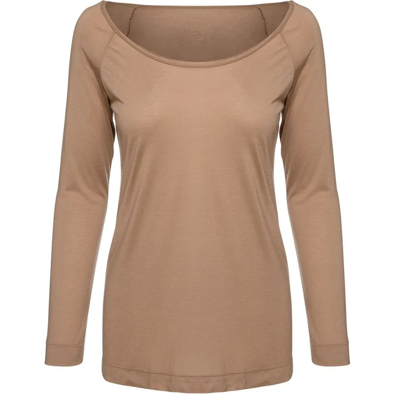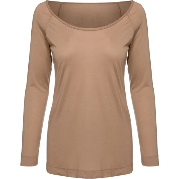 Deze top is gemaakt van lichtgewicht fijne stof: micromodaal kasjmier. Het heeft een wijde boothals met een naadloze lasergesneden dubbele bies. Het heeft lange raglanmouwen. De manchetten en zoom hebben een omslag van 4 cm. De top heeft een ontspannen silhouet en kan off-shoulder gedragen worden.
