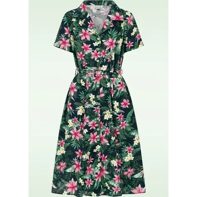 ''Instant summer vibes!'' Deze zomerse swing jurk heeft een elegante V-halslijn, korte mouwtjes en loopt uit in een prachtige swing rok, die jou een prachtig vrouwelijk silhouet geeft! Uitgevoerd in een stevige, maar soepele marineblauwe katoenmix (stretcht nauwelijks) met een print van tropische bloemen. * Swing model * V-halslijn * Reverskraagje * Korte mouwtjes * Reeks knopen * Afneembare riem voor een extra 'snatched' taille * Zijwaartse steekzakken * Valt bij een lengte van 1,70 m over de knie