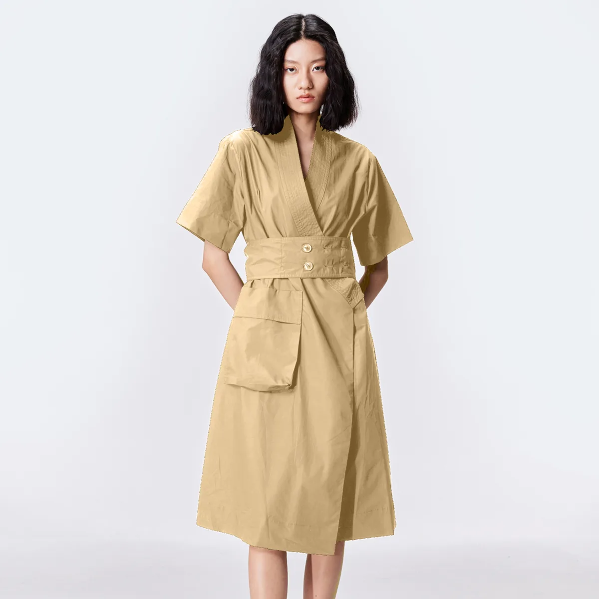 Een stuk dat het silhouet elegant benadrukt met een V -halslijn en een brede riem die de taille benadrukt. Losse kimono -mouwen, hartbedekking sluitingssysteem en zak verguld op de heupen. Een jurk van karakter om te associëren met platte sandalen om de Zen -kant te spelen of te stimuleren met laarzen of sneakers. Productdetails • Vorm: rechte en riem • Lengte: 106 cm • Gerichte riem • Wikkelsysteem