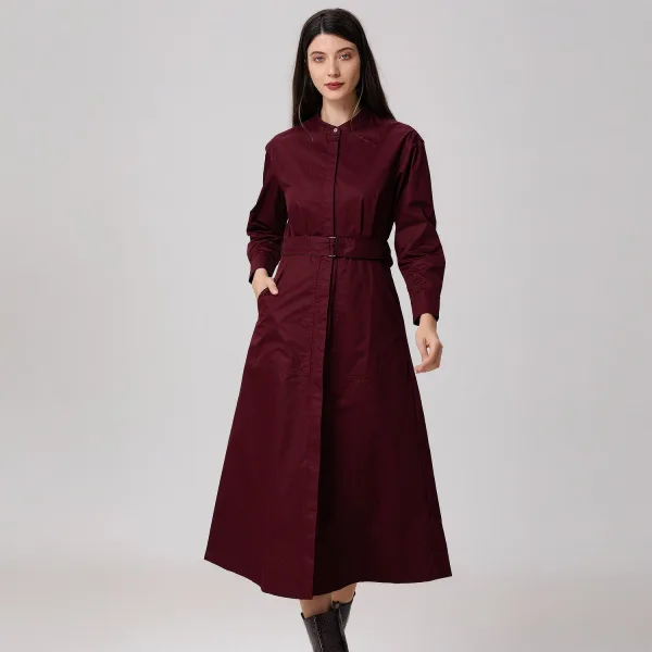 Een sobere lijn die het silhouet accentueert: gestructureerd met subtiele details: vierkante doorgestikte zakken, hoge kraag met knoopsluiting, getailleerde taille versierd met een riem, een royaal uitlopende volume die tot aan de kuiten reikt. Deze overhemdjurk is geschikt voor semi-formele gelegenheden in de stad, op kantoor of voor meer casual uitstapjes. Productdetails: Model: recht/trapeziumvormig Lengte: 127 cm Kraag Lange mouwen met geknoopte manchetten Knoop middenvoor verborgen door een sluiting