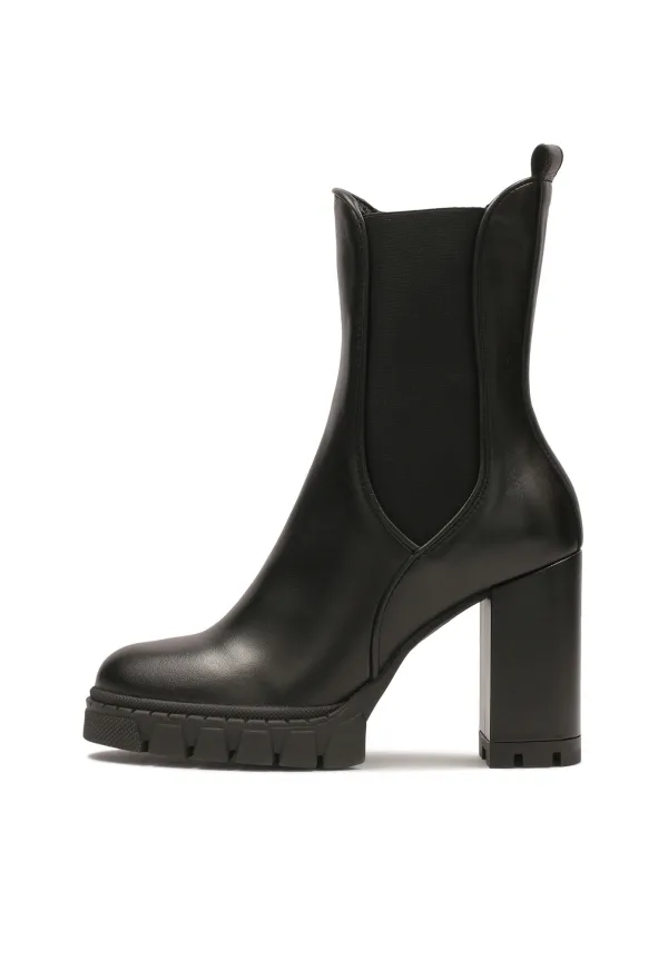 Design: Elastische inzetstukken, Hielband; Type sluiting: Ritssluiting; Type hak: Blokhak; Materiaal: Leer; Motief: Effen; Plateau: Met plateau; Materiaal: Glad leer; Schoenneus: Ronde neus; Extra's: Op staal naden, Gladde stof; Hakhoogte: High heels (> 10 cm)