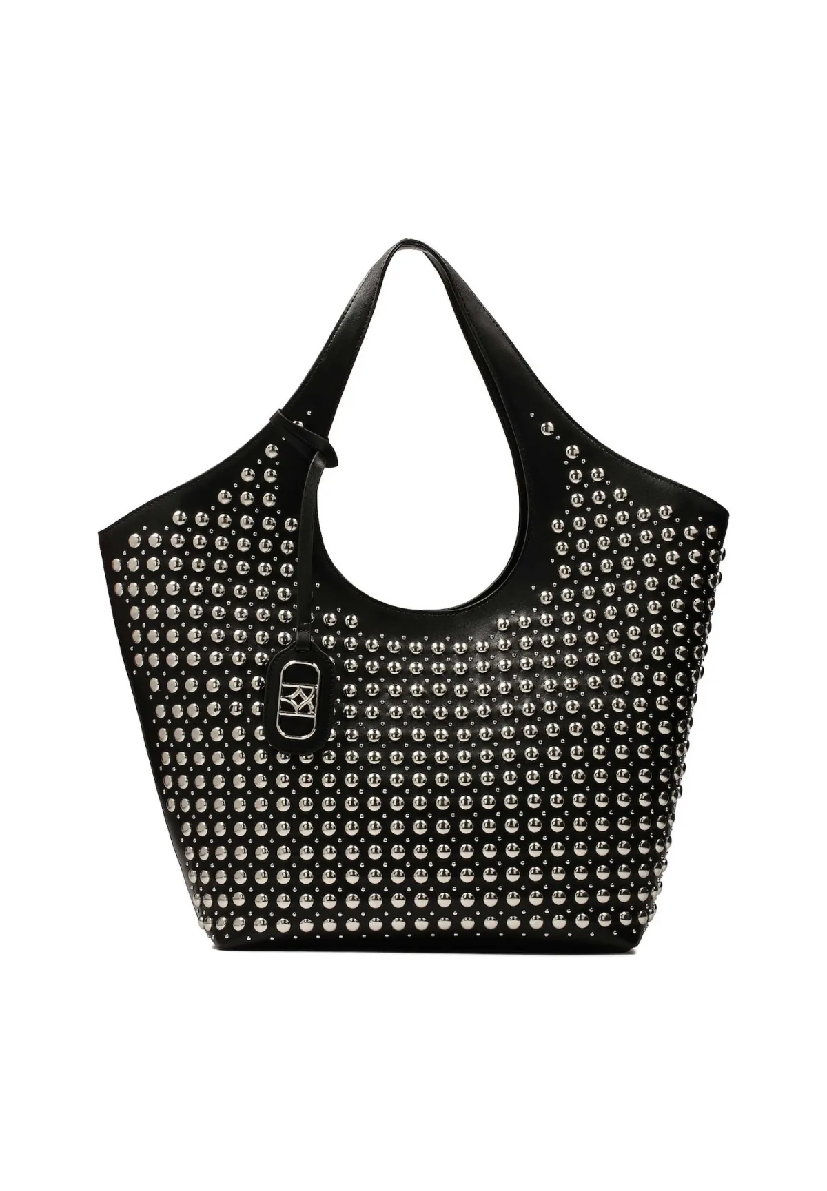 Design: Ruim hoofdvak, Ritsvak binnen; Type sluiting: Magnetische sluiting; Materiaal: Leer; Motief: Gestippeld; Materiaal: Glad leer; Extra's: Studs, All-over patroon, Op staal naden, Stevige stof; Maat: Klein; Hengsellengte: Korte schouderriemen