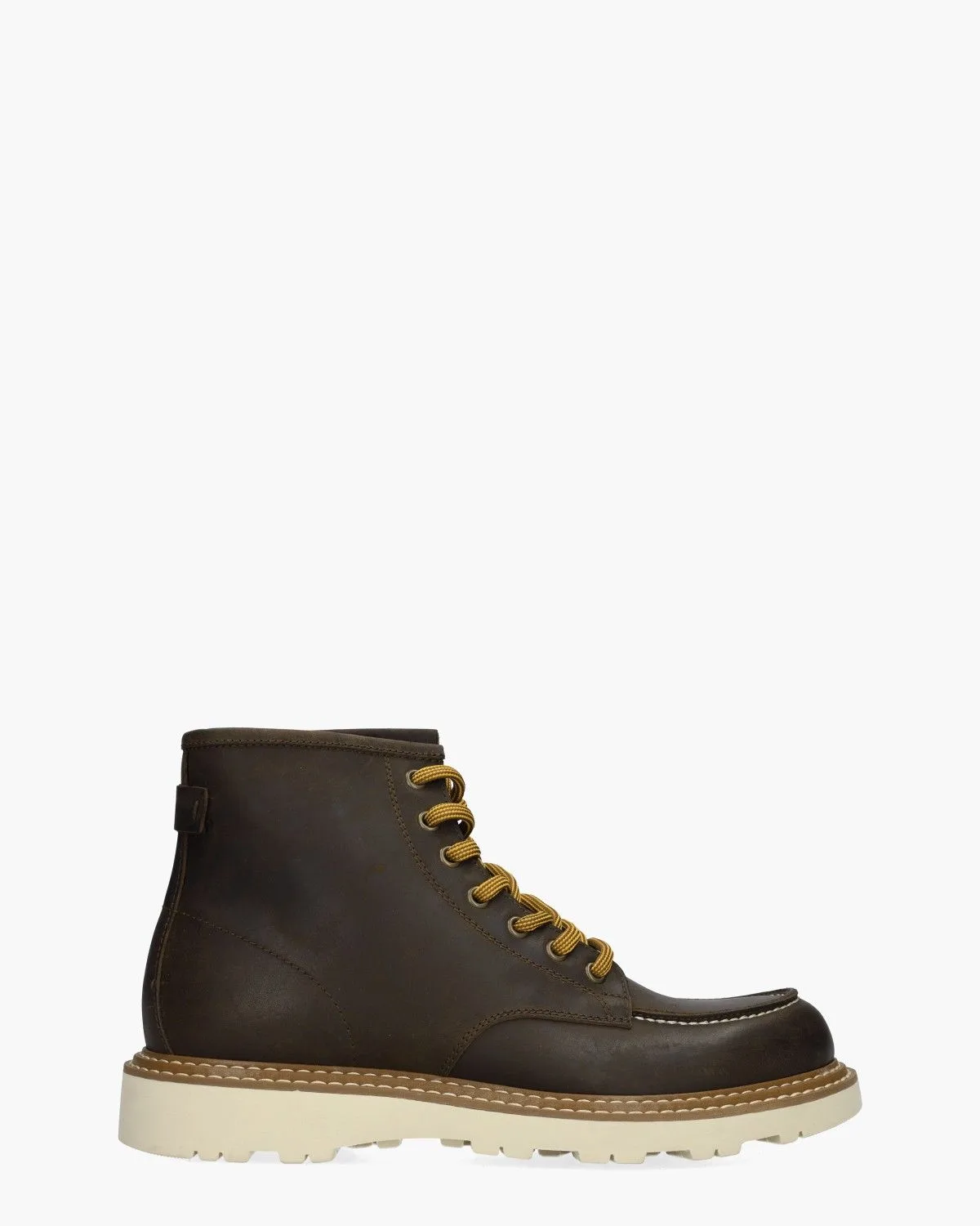 Met de Kebo DK7010 veterboots in donkerbruin leer kies je voor een robuuste stijl die toch verfijnd oogt. Het leren bovenwerk heeft een lichte vintage uitstraling en wordt krachtig aangezet door de gele veters en contrasterende stiksels. De rubberen profielzool geeft het model een moderne basis. Aan de achterkant van de 13 cm hoge schacht is
