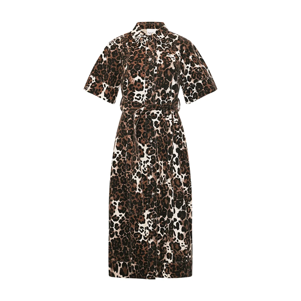 Een eigentijdse overhemdjurk met korte, wijde mouwen, een knoopsluiting aan de voorkant en een bijpassende tailleriem voor een gedefinieerd silhouet. Gemaakt van een zachte, gestructureerde stof met een all-over print, biedt deze jurk de perfecte balans tussen casual gemak en gedurfde elegantie.