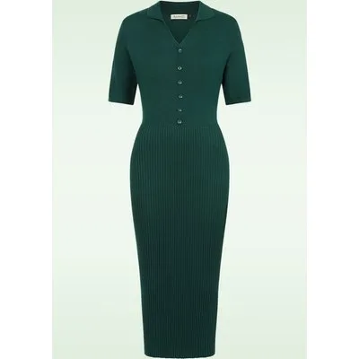 “Knitted comfort, collared in style.” Deze A-lijn jurk heeft een sierknopen reeks, een puntig kraagje, 1/2 mouwtjes en is uitgevoerd in een iets dikkere, fijn gebreide, stretchy viscosemix in donkergroen. * A-lijn model * Kraagje * Sierknopen * 1/2 mouwtjes * Geen rits of knopen; aantrekken en ready to go! * Valt bij een lengte van 1,70 m ruim over de knie