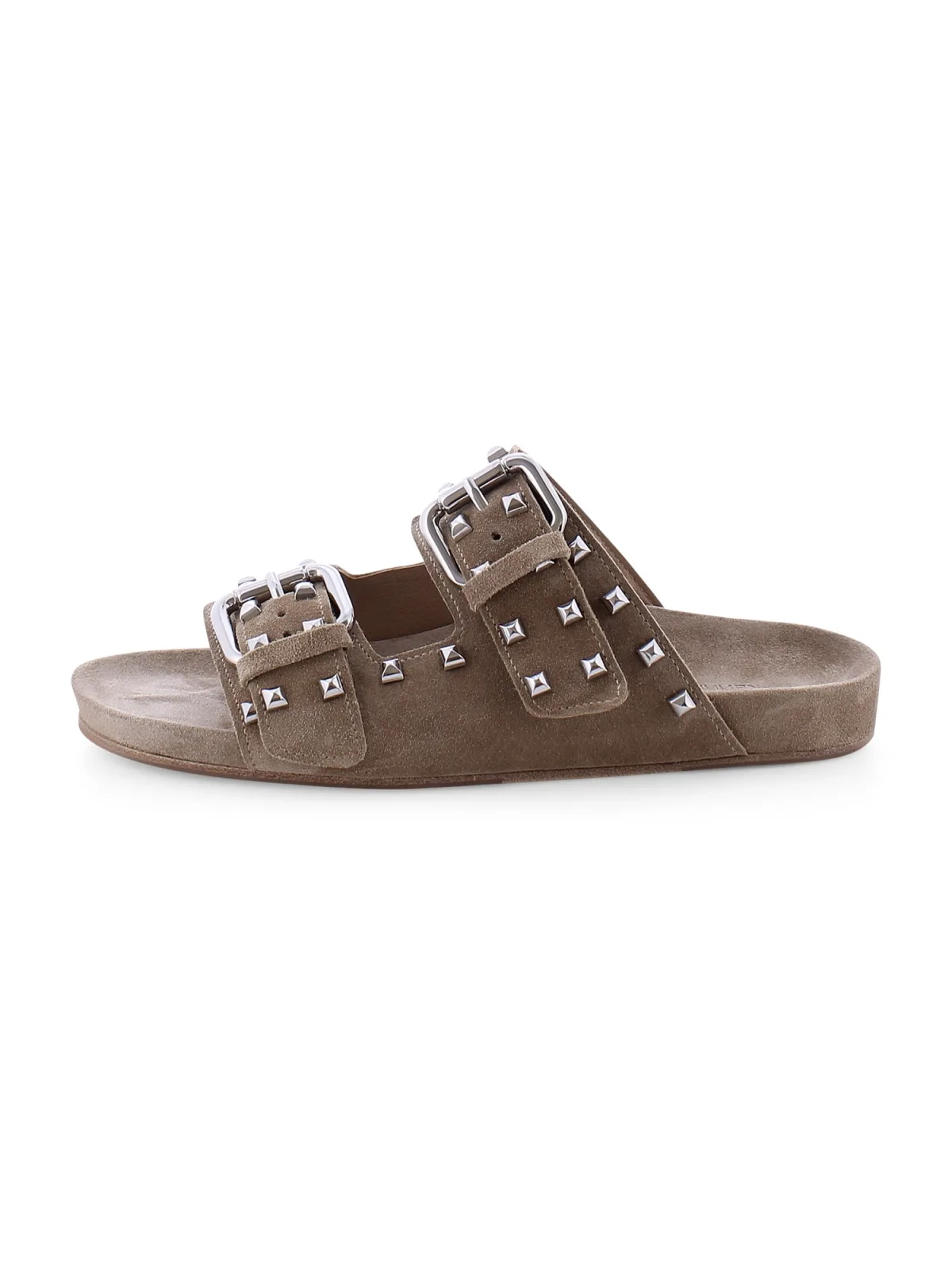Design: Profielzolen; Type sluiting: Open; Materiaal: Leer; Motief: Effen; Materiaal: Suède; Schoenneus: Open toe; Extra's: Op staal naden; Hakhoogte: Platte hak (0-3 cm)