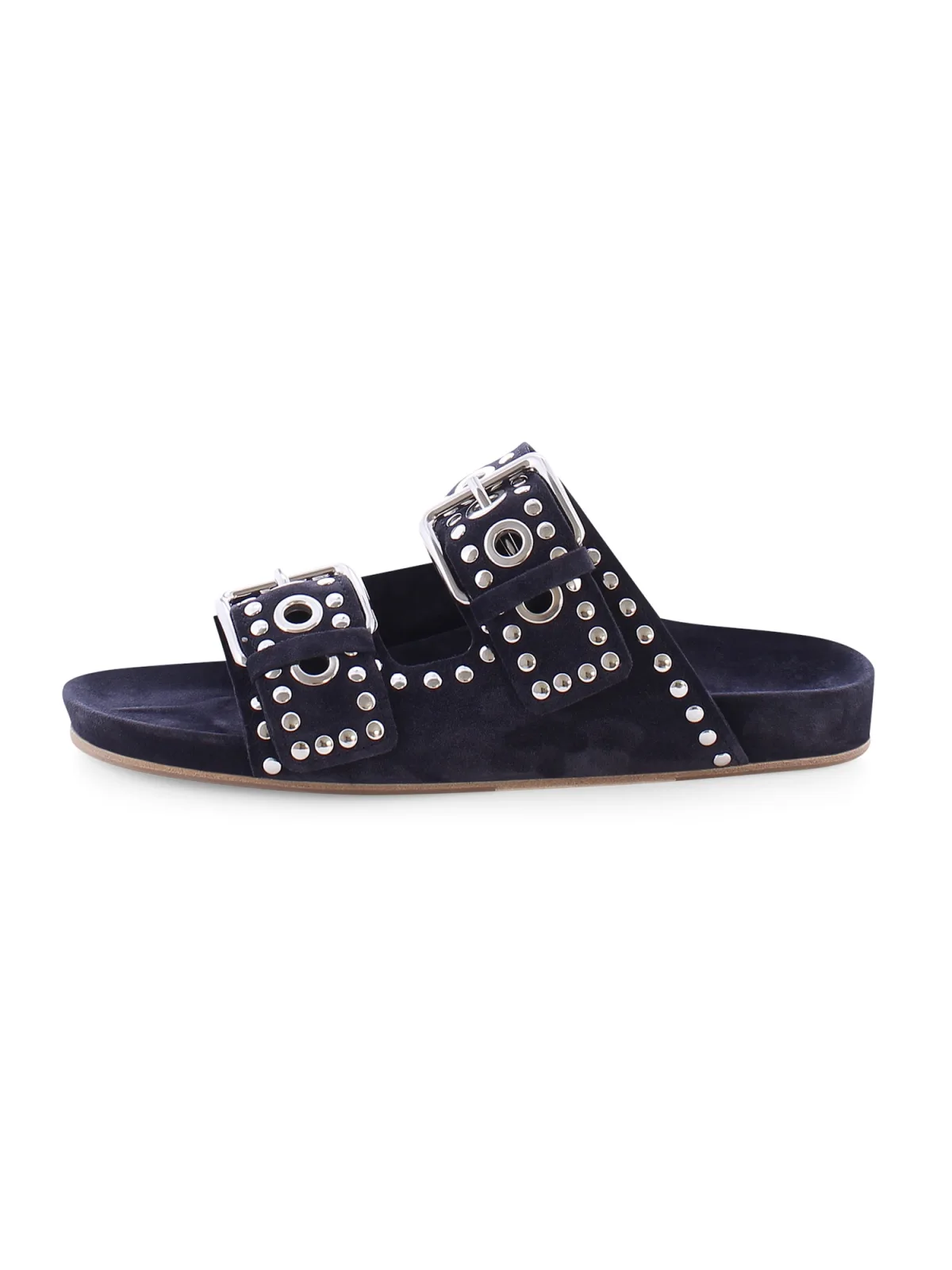 Design: Profielzolen; Type sluiting: Slip; Materiaal: Leer; Motief: Gestippeld; Materiaal: Suède; Schoenneus: Open toe; Extra's: Studs; Hakhoogte: Platte hak (0-3 cm)