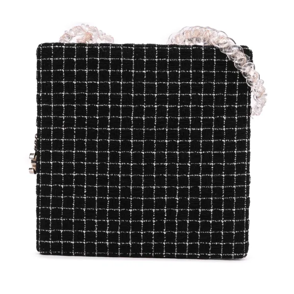 Draag moeiteloos, loop vol vertrouwen, beheers het moment. Deze tweedehands shopping tas van tweed en resin biedt ongeëvenaarde verfijning voor elke gelegenheid. Het zwart-witte ruitpatroon straalt tijdloze elegantie uit, terwijl de heldere acryl kettingriem een moderne, edgy twist toevoegt. Geniet van duurzame, onderhoudsarme materialen die meegaan in je drukke leven. Deze tas integreert naadloos in je levensstijl en verheft je dagelijkse look met een vleugje verfijnde glamour. Afmetingen: 23 x 23 x 6,5 cm Staatsscore: B Staat Informatie: Externe hoeken versleten. Versiering gekrast. Externe handgreep bevlekt door kleuroverdracht. Binnenvoering opnieuw geschilderd. Externe zijkant versleten. Bovenkant extern versleten. Ritssluiting gekrast.