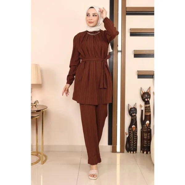 Stofkenmerk: Gemaakt van viscose stof. Productkenmerk: Nieuwe seizoens hijab modeproduct en niet gevoerd. De tuniek heeft een rits aan de achterkant en één knop. De manchet is elastisch. De riem is afneembaar. De broek heeft een elastische taille. De productkleur kan afwijken door conceptfoto's. Het model draagt tuniek maat 38. Maten van het product: Productlengte: 87 cm - Borst: 90 cm - Taille: 88 cm - Heupen: 102 cm. Maten van de broek maat 38: Productlengte: 100 cm - Taille: 74 cm - Heupen: 86 cm. Lichaamsmetingen nemen met 3 of 4 cm toe. (Productlengte verandert niet)