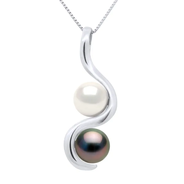 Halsketting Link Venetiaans van Zilver 925 Rhodium geplaatst met Hangertje 'Jij & Ik' versierd met 2 Echte Cultiveerde Parel Ronde 8-9 mm - ECHTE TAHITI + ZOETWATER KLEUR NATUURLIJK WIT - Lengte 42 cm - Geleverd met Certificaat van Echtheid en Internationale Garantie - GEMAAKT IN FRANKRIJK