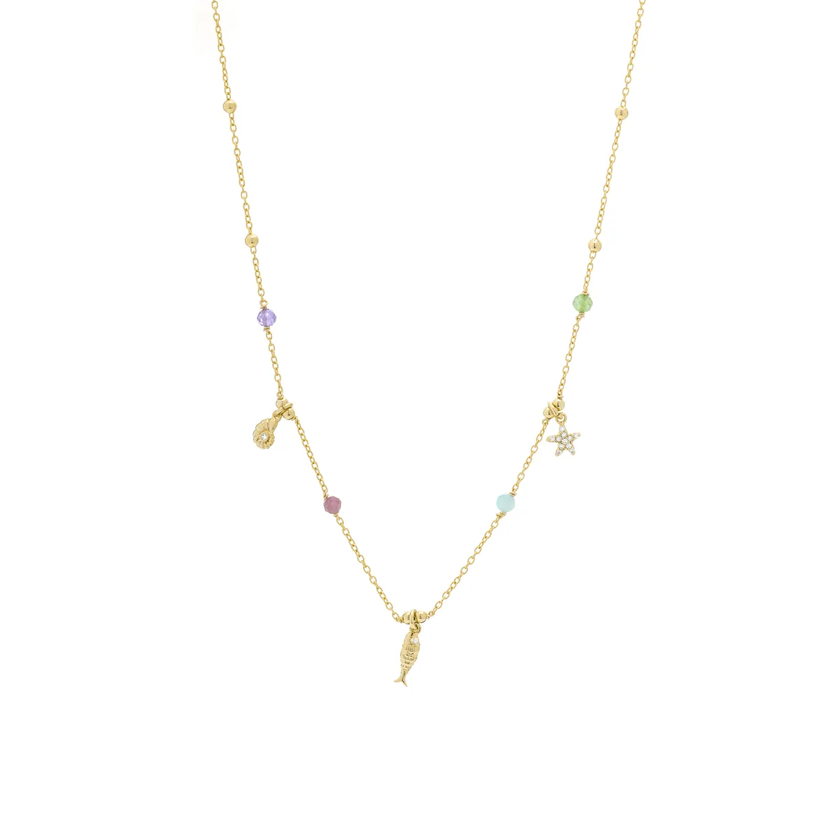 Kaiquia ketting in 925 sterling zilver en veelkleurig kristal afgewerkt in 18k geel goud. Make a wish wordt gekenmerkt door ontwerpen met een jong karakter, vol betekenis en kleur, origineel en discreet tegelijk, die bedoeld zijn om kleine bedeltjes te worden.
