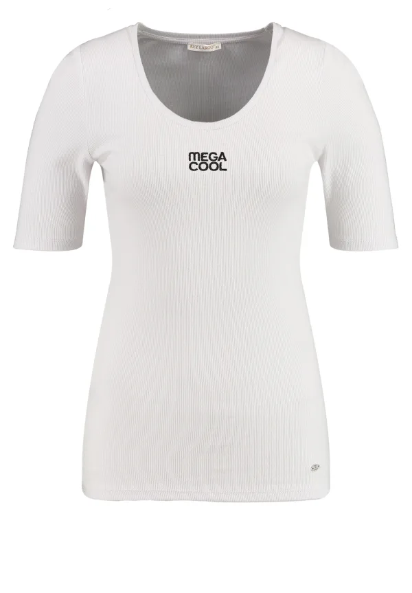 Design: Gevoerde zoom/rand; Materiaal: Katoen; Halstype: Ronde hals; Motief: Tekst print; Details: Borduursels; Extra's: Op staal naden, Met textuur; Pasvorm: Slanke pasvorm; Armlengte: Kwartmouw; Lengte: Normale lengte