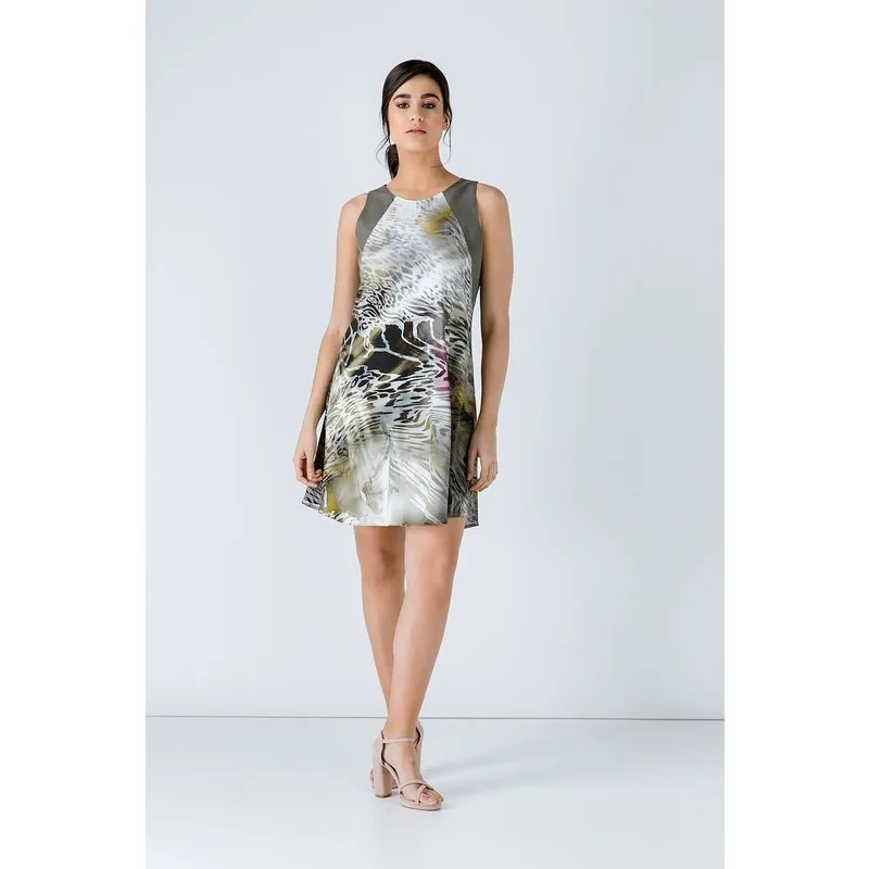 Deze zomerjurk met dierenprint is gemaakt van viscose-elastaan. Op de schouders zit kaki geweven tencelstof. Het is mouwloos en heeft een ronde halslijn. Hij sluit met een decoratieve plastic knoop op de rug. Het is ongevoerd en heeft een A-lijn silhouet.
