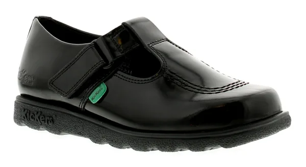 Stuur ze in stijl terug naar school met de Fragma T-Bar schoenen van het iconische merk Kickers. De glanzend zwarte leren flat in Mary-Jane-stijl heeft een klittenbandsluiting en een loopzool met veel grip - perfect om over de speelplaats te rennen.