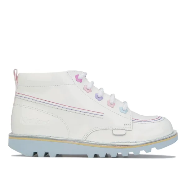 Kickers Kick Hi Fleur Patent Boots in wit voor meisjes. - Glanzend bovenwerk van lakleer. - Vetersluiting met oogjes in de vorm van een bloem. - Ritssluiting aan de binnenkant en geweven hiellipje voor gemakkelijk aan- en uittrekken. - Klassiek drievoudig stikdetail. - Iconische Kickers fleurette en lipjes. - Gevoerde kraag. - Kickers merk op tong en zijkant hiel. - Duurzame rubberen zool. - Lederen bovenkant Synthetische en textiel voering Rubberen zool. - Ref: 1-15799