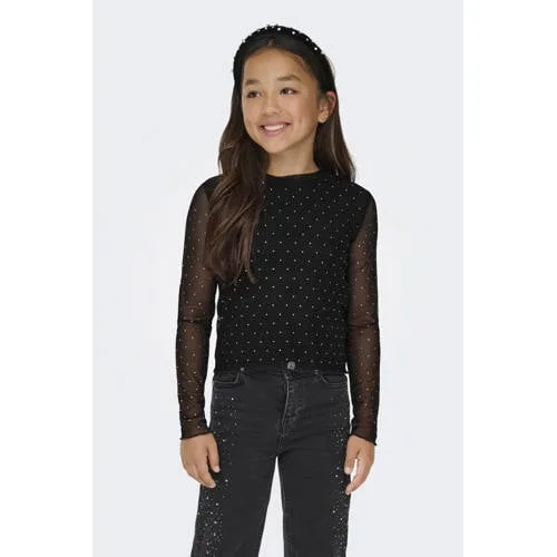Deze top van KIDS ONLY GIRL heeft rechte mouwen en een ronde hals. De stof is semi-transparant en gemaakt van polyester met elastaan, je ziet strass steentjes op de stof voor een speels effect.