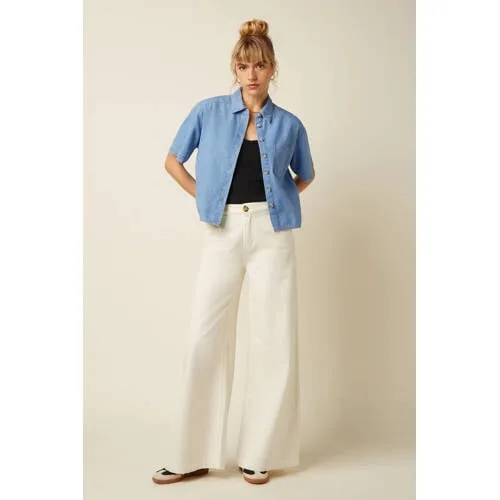 De King Louie Evalina denim blouse in light blue denim is een frisse, luchtige basic voor het voorjaar. Het rechte model met korte mouwen en klassieke kraag geeft een rustige, tijdloze uitstraling, terwijl de lichte denimkleur makkelijk combineert met je garderobe. Gemaakt van 100% katoen voelt deze blouse soepel en ademend aan, geschikt voor dagelijks gebruik.Verzorgde details in licht denim Gemaakt van 100% katoen, geschikt om te dragen in het voorjaar en op warmere dagen Klassieke kraag en knoopsluiting aan de voorkant voor een nette, verzorgde look Korte, rechte mouwen die comfortabel vallen rond de armen Borstzak als subtiel detail, handig voor een klein item Effen light blue denim, makkelijk te combineren met zowel uni als prints Wasbaar op 30 graden, warm strijkbaar (2 punten) en drogen op lage temperatuur (1 punt)Voor werk, weekend en vakantieDeze denim blouse past goed bij een rechte pantalon voor een rustige kantoorlook, maar ook bij een witte jeans of korte broek voor een ontspannen weekendstijl. Draag de Evalina open over een eenvoudig T-shirt of dichtgeknoopt in de broek voor een meer geklede uitstraling.King Louie: herkenbare stijl met oog voor detailKing Louie is een Nederlands merk dat bekendstaat om vrouwelijke collecties met herkenbare details en doordachte pasvormen. De ontwerpen hebben vaak een tijdloze basis, zodat je favoriete items seizoen na seizoen mee kunnen. Met deze Evalina blouse kies je voor een stijl die verzorgd oogt en gemakkelijk te combineren is.Een lichte denim blouse die je garderobe rustig aanvult en geschikt is voor veel verschillende momenten.