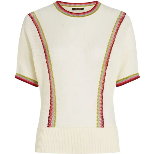 De Daria Top Emel van King Louie is een dames top in off white met kleurrijke randjes. Het model is gemaakt van organisch katoen en heeft een ronde hals. De lengte is normaal en de pasvorm is een regular fit. Draag deze top bijvoorbeeld op een jeans of rok voor een rustige, verzorgde look. Een heldere basic met nét dat extra detail, voor een zelfverzekerde stijl.