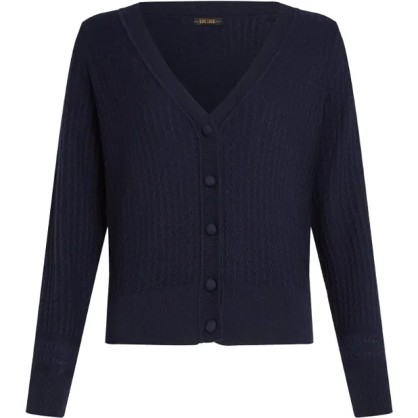 Het deep v cardi cedar van King Louie is een inktblauw gebreid vestje dat soepel om je heen valt en je silhouet op een subtiele manier benadrukt. Het mix van katoen, viscose, polyamide en een vleugje wol geeft het vest een zachte, lichtvolle structuur die zowel warmte als luchtigheid biedt, perfect voor dagen waarop je net wat extra wilt. De V-hals geeft ruimte voor een sjaal of een fijn T-shirt eronder en trekt de aandacht naar je gezicht, terwijl de knoopsluiting een klassieke touch toevoegt. Dankzij de iets kortere lengte kun je het vest gemakkelijk met een pantalon, over een jurk dragen of met je favoriete jeans combineren zonder te veel volume toe te voegen. Het ingebreide dessin voegt karakter zonder te overheersen, waardoor het stuk zowel rustiek als verfijnd oogt. Kies dit King Louie vest wanneer je op zoek bent naar een tijdloos item dat net dat beetje extra stijl en plezier aan je look geeft.