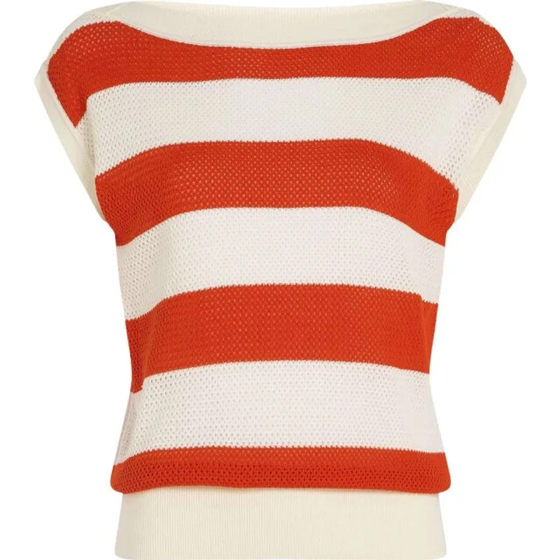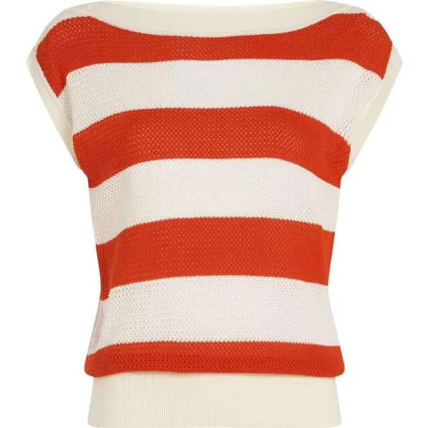 “Soft, striped & seriously cute.” Deze knitted top is onmisbaar in je garderobe! Ze heeft een elegante boothals, korte kapmouwtjes en is uitgevoerd in een zachte, soepele en stretchy organische katoenmix met een opengewerkt ajour- en streeppatroon in oranje en crème. * Boothals * Kapmouwtjes * Opengewerkt ajourpatroon * Stretchy ribboord * Lang genoeg om op een normale heupbroek te dragen