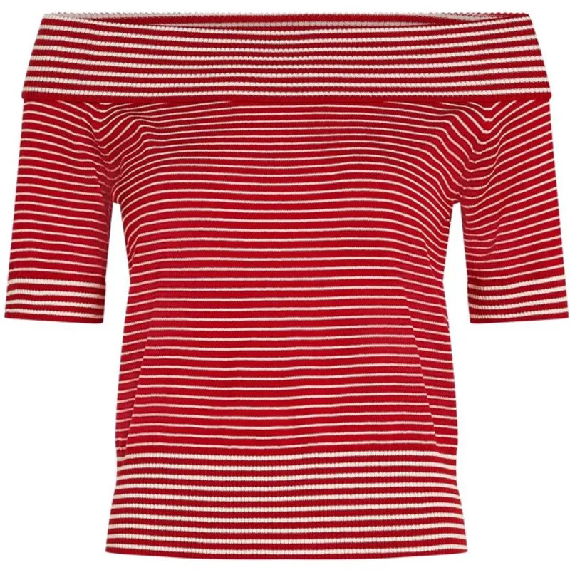 De Nives Top d’Oleron van King Louie is een dames top in rood met een subtiel wit streepjesdessin. Het model is fijn gebreid van organisch katoen en heeft een normale lengte met een regular fit. De brede rand kan ook off shoulder gedragen worden. Draag hem bijvoorbeeld op een high-waist broek of rok voor een rustige, moderne look. Een heldere top die je outfit met eenvoudige zekerheid neerzet.