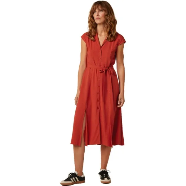 De Violante Dress Deniz van King Louie is een damesjurk in effen rood, met een klein ingeweven patroontje. De jurk is gemaakt van viscose en heeft een lange blousemodel met normale pasvorm. In de taille is het model geknepen en afgewerkt met een strikbandje, waarna de rok zwierig uitloopt. In de zijnaden zitten insteekzakken. Draag met eenvoudige sandalen voor een rustige, verzorgde look met zelfvertrouwen.