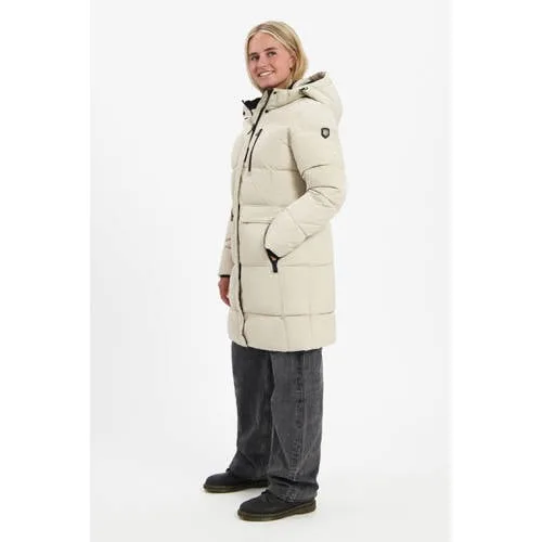 Kjelvik dames jas Marley is een heerlijke lange gewatteerde winterjas met padding. Deze jas heeft een PFC-vrije waterafstotende finish en is winddicht. Verder beschikt de jas over een afneembare capuchon, twee steekzakken met rits en decoratieve flap, een borstzak met ritssluiting en een handige 2-wegrits.