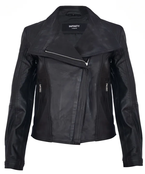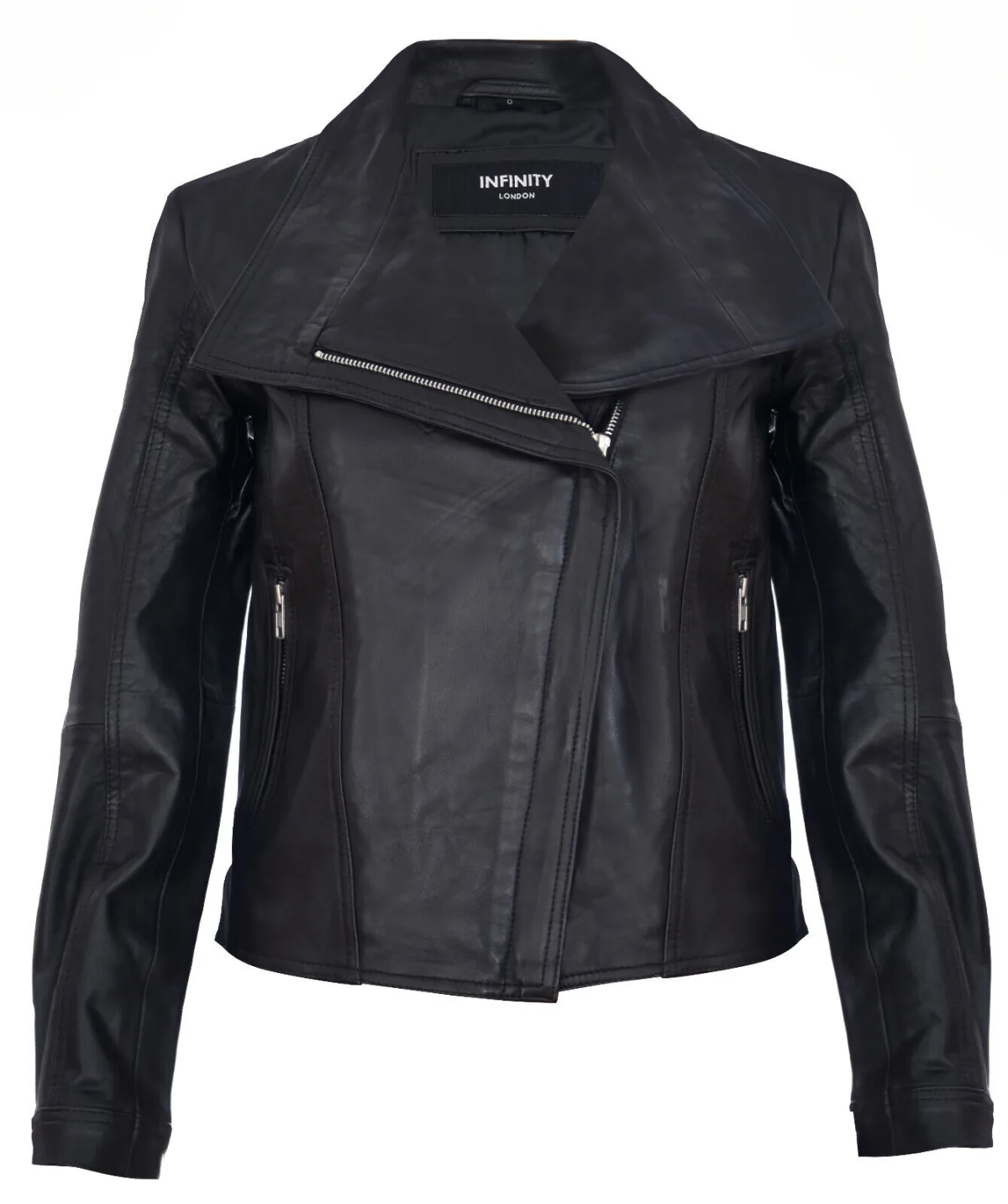 Klassiek leren dames bikerjack met sjaalomslag Morpeth