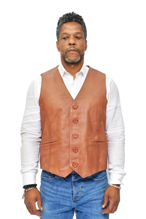 Een traditioneel gilet met V-hals dat door zijn eenvoudige ontwerp een elegante look geeft. Dit minimalistische thema wordt geaccentueerd door de sluiting met vijf knopen, die in dezelfde kleur verschijnt als het lijfje van het gilet, voor een strakke en ingetogen esthetiek. We bieden dit gilet aan in verschillende kleurstellingen, waaronder verweerd zwart voor een vintage look en bordeauxrood voor gelegenheden die om een spannendere outfit vragen. Dit gilet zorgt voor comfort door een verstelbare tailleriem voor een slanke pasvorm en twee borstzakken in de taille voor extra gebruiksgemak. • Gemaakt van ultrazacht nappaleer • Twee steekzakken aan de voorkant van het gilet • Voorzien van een V-halslijn en vijf knopen voor het vastmaken van de voorkant van het gilet