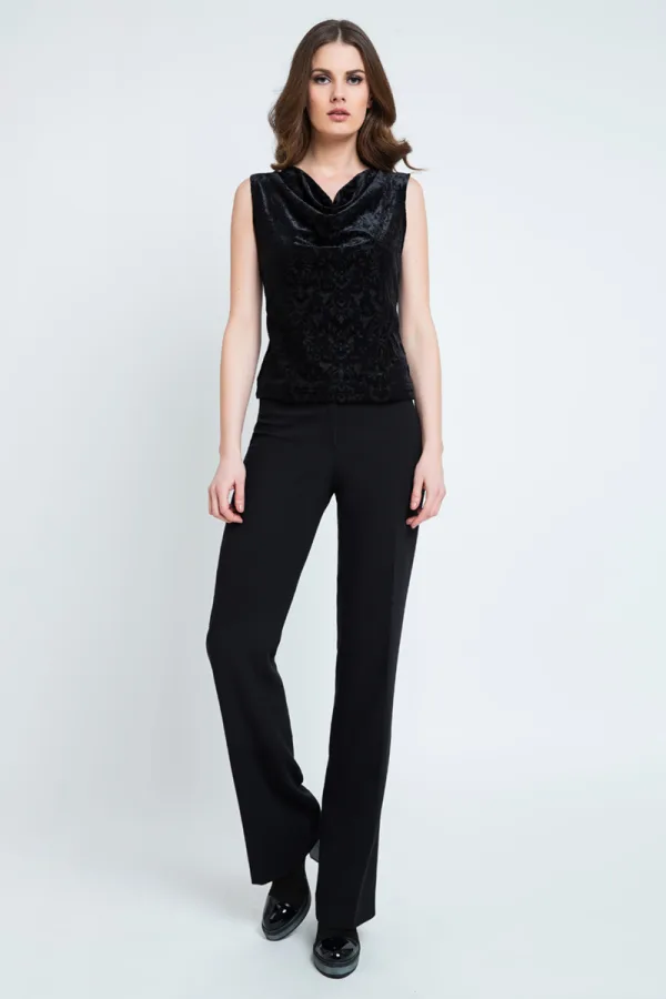 Klassieke zwarte broek van geweven stof met een lichte stretch. Tailleband met riemlussen. Sluit met een verborgen rits en een zwarte plastic knoop. Twee kleine plooien aan de achterkant die vanaf de tailleband beginnen voor de perfecte pasvorm. Recht silhouet op volledige lengte. Lengte: 110 cm voor maat 38. Extra stof aan de zoom maakt het mogelijk om deze tot 3 cm te verlengen. Ons model is 178 cm lang en draagt maat 36.