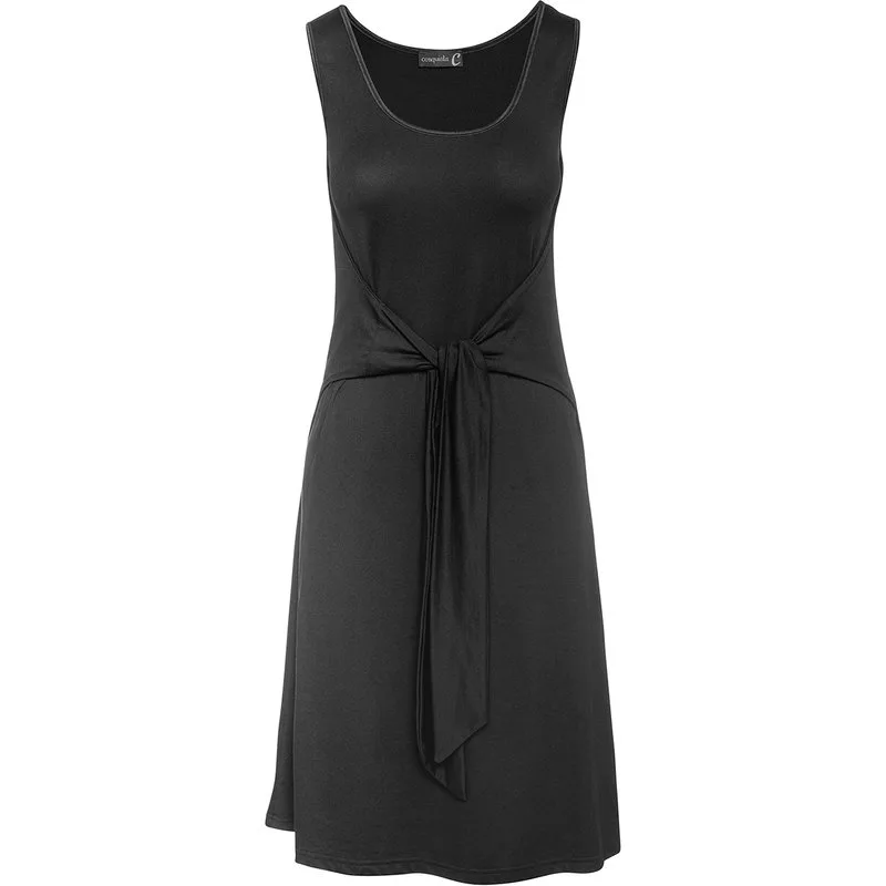 Onze klassieke zwarte jerseyjurk is het toonbeeld van veelzijdige mode. Gemaakt van 100% polyester jersey, biedt het zowel comfort als duurzaamheid. Het mouwloze ontwerp en de zachte ronde halslijn creëren een tijdloos silhouet, terwijl het unieke knoopdetail aan de voorkant een vleugje moderne flair toevoegt, waardoor deze jurk een verhoogde uitstraling krijgt. De vloeiende drapering van de jerseystof zorgt voor een flatterende pasvorm voor alle lichaamstypes, en de toegevoegde stretch zorgt voor vrije beweging gedurende de dag. Of je hem nu draagt met hakken voor een avondje uit of met platte schoenen voor overdag: deze jurk is een basisstuk dat moeiteloze elegantie uitstraalt.