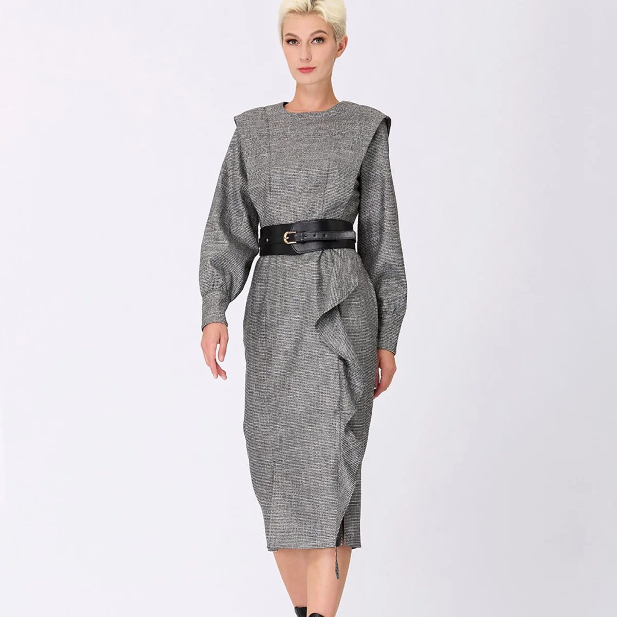 Deze jurk heeft twee grote plooien, beginnend bij de taille en eindigend op de schouder. Een ruche siert de linkerkant van de rok vanaf de taille en valt naar de knie. Eindelijk heeft de zoom twee spleten vooraan. Een statement -stuk dat geschikt is voor een kantooroutfit of om uit te gaan in het restaurant. Om te associëren met een riem (niet geleverd). Productdetails: • Formulier: Cut-to-Fit • Lengte: onder de knie: 118 cm • Lange mouwen (shirt mouwen) • Bootkraag • Invisible Zipper Center Back