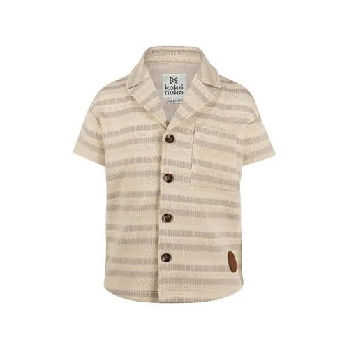 Voor een relaxte, moderne look in de kinderkast is dit Koko Noko jongens overshirt met korte mouw een praktische basis. Het beige shirt heeft een losvallende pasvorm en voelt soepel aan, waardoor er genoeg ruimte is om te spelen en te bewegen. Het ingebreide streeppatroon zorgt voor een rustige, speelse uitstraling.Streepjes overshirt voor speelse dagen Overshirt met korte mouwen, geschikt voor de warmere dagen of met een T-shirt eronder Loose fit pasvorm voor extra bewegingsvrijheid Reverskraag en volledige knoopsluiting voor een nette, maar toch ontspannen uitstraling Borstzak als praktisch detail om kleine spulletjes in te bewaren Ingebreid streeppatroon in een rustige beige kleur, goed te combineren Geschikt voor baby, peuter, kleuter en schoolkind, binnen dezelfde stijl Wasbaar op 30 graden, lauw strijkbaar en geschikt voor een regulier droogprogrammaGemakkelijk in het dagelijks gebruikDit overshirt is onderdeel van de 'Daily' collectie en is daarmee geschikt voor alledaagse outfits. Draag het open over een basic T-shirt met een korte broek of jeans, of dichtgeknoopt voor een iets verzorgdere look. De knoopsluiting maakt aan- en uitkleden eenvoudig, ook voor drukke ochtenden.Koko Noko voor kleine ontdekkersKoko Noko ontwerpt kinderkleding die past bij nieuwsgierige kinderen die de wereld willen ontdekken. De stijlen zijn comfortabel en eigentijds, met aandacht voor details die het aankleden net wat leuker maken. Zo ontstaat kleding die goed aansluit bij het dagelijkse leven van kinderen.Een veelzijdig overshirt dat moeiteloos meebeweegt met het dagelijks leven van je kind.