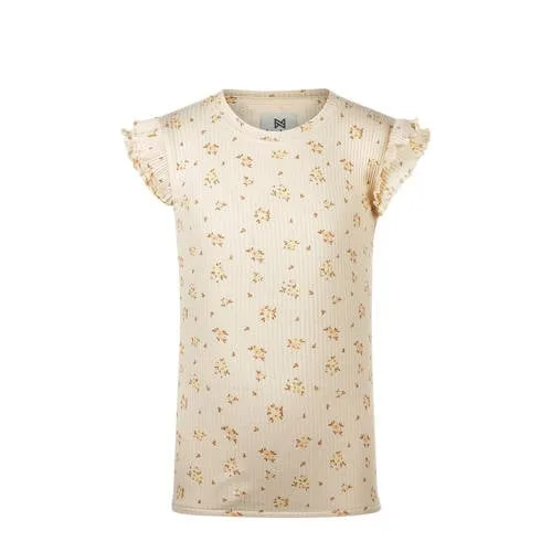 Dit T-shirt voor meisjes van Koko Noko heeft een ronde hals en kapmouwtjes. Het is uitgevoerd in beige, geel en roestbruin en gemaakt van katoen met elastaan. Het ribgebreide detail en ruches maken het bijzonder.