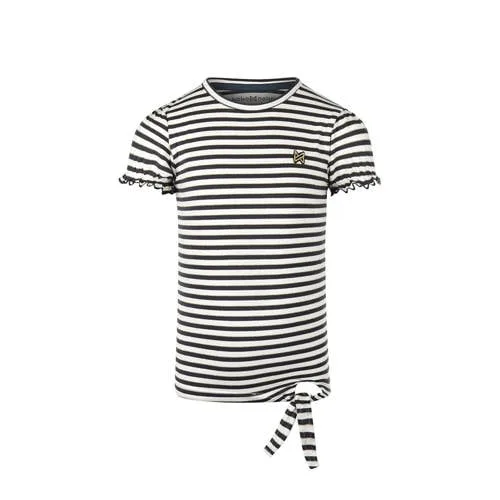 Dit donkerblauw-witte T-shirt voor meisjes van Koko Noko heeft een ronde hals en pofmouwen. Gemaakt van een mix van katoen, lurex en elastaan. Het knoopdetail geeft een speels accent aan het ontwerp.