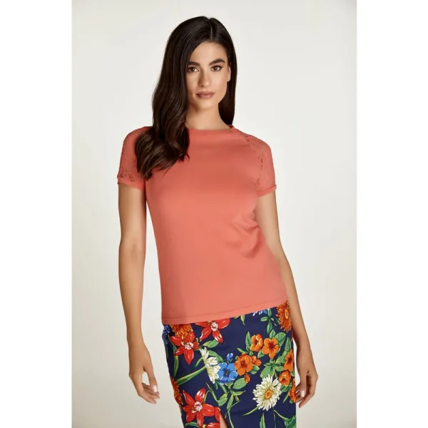 Deze koraalkleurige top van stretchjersey is gemaakt van katoen-elastaan. Het heeft een ronde halslijn met een bies van 0,5 cm in dezelfde stof. De top heeft korte raglanmouwen van ecru kanten stof met stretch jersey boorden aan de manchetten. Het silhouet is getailleerd.