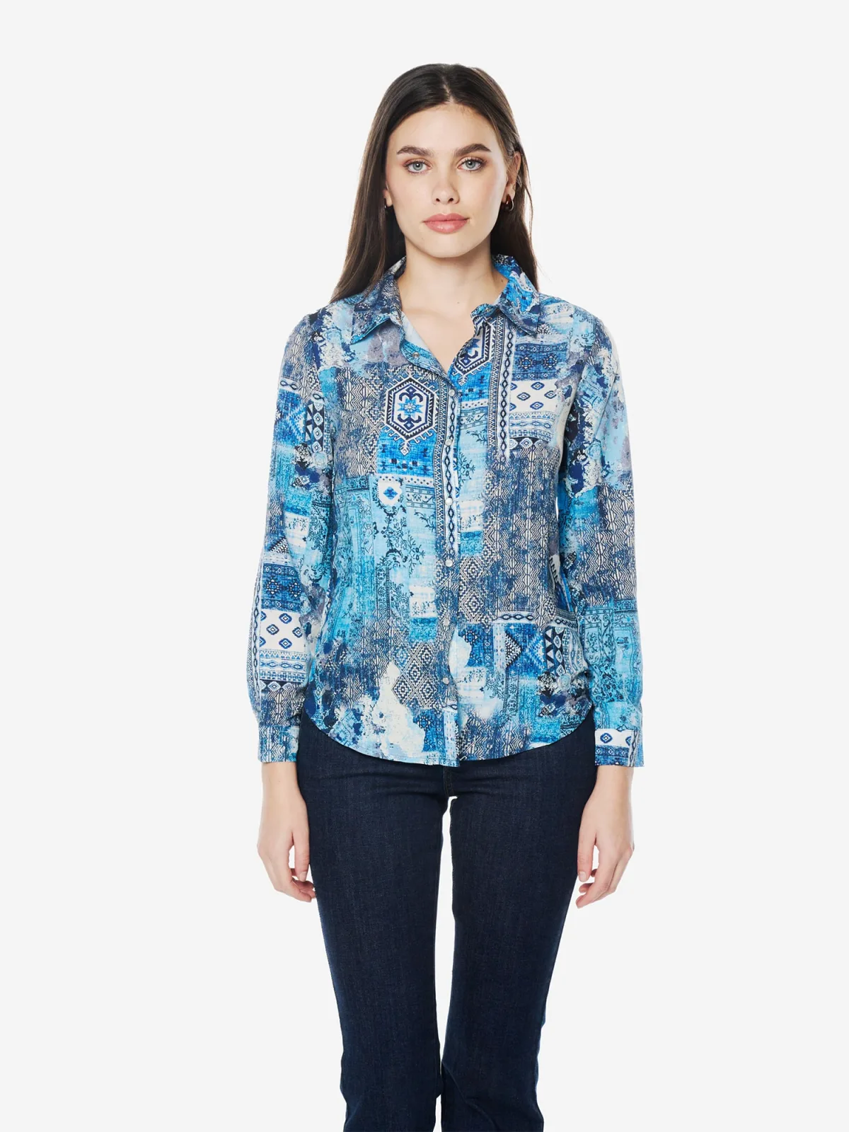 Blouse type: Klassieke blouse; Design: Ronde zoom; Type sluiting: Drukknoop; Materiaal: Viscose; Kraag: Kentkraag; Details: Plooien; Extra's: All-over patroon, Voelt zacht aan; Pasvorm: Normale pasvorm; Armlengte: Lange mouw; Lengte: Normale lengte