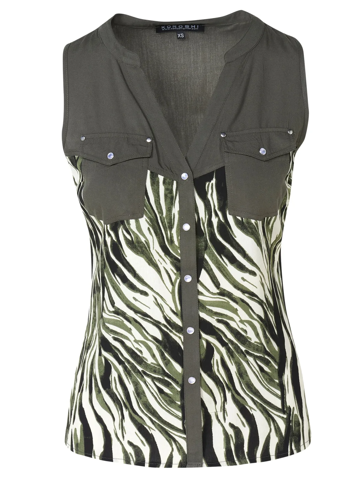 Blouse type: Klassieke blouse; Design: Borstzak; Type sluiting: Knoopsluiting; Motief: Dierenprint; Kraag: Tuniek kraag; Extra's: Voelt zacht aan; Pasvorm: Normale pasvorm; Armlengte: Mouwloos; Lengte: Normale lengte