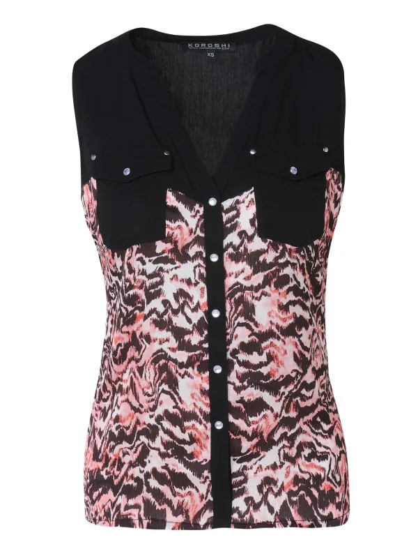 Blouse type: Klassieke blouse; Design: Gevoerde zoom/rand, Borstzak; Type sluiting: Knoopsluiting; Kraag: Tuniek kraag; Extra's: All-over patroon, Gladde stof; Pasvorm: Normale pasvorm; Armlengte: Mouwloos; Lengte: Normale lengte