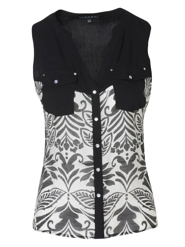 Blouse type: Klassieke blouse; Design: Borstzak; Type sluiting: Knoopsluiting; Motief: Bloemenprint; Kraag: Tuniek kraag; Extra's: Studs; Pasvorm: Normale pasvorm; Armlengte: Mouwloos; Lengte: Normale lengte