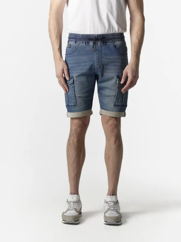 Design: Taille met trekkoord, Elastische taille/zoom, Cargozak, Achterzak, Zakken aan de zijkant; Materiaal: Denim; Motief: Effen; Extra's: Gewassen effect, Vaste grip; Wassing: Blauw denim; Lengte: Knielengte; Pasvorm: Regular