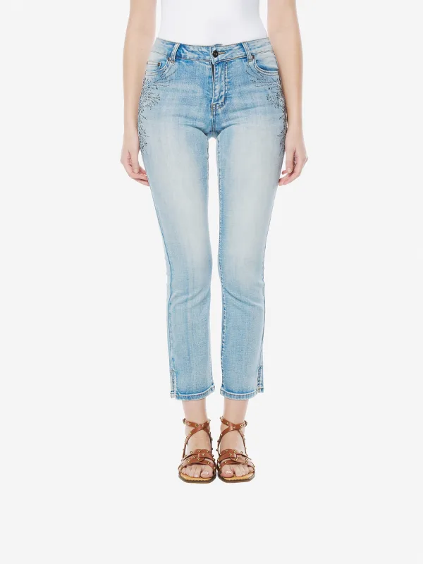 Design: Zijdelingse inkepingen, Ritssluiting, Knop sluiting; Type sluiting: Knoopsluiting; Materiaal: Denim; Details: Sierstenen, Patches; Extra's: Studs, Contrasterende naden, Label patch/label flag, Riemlussen; Wassing: Light washed; Lengte: 7/8 lengte; Pasvorm: Slimfit; Taillehoogte: Mid waist