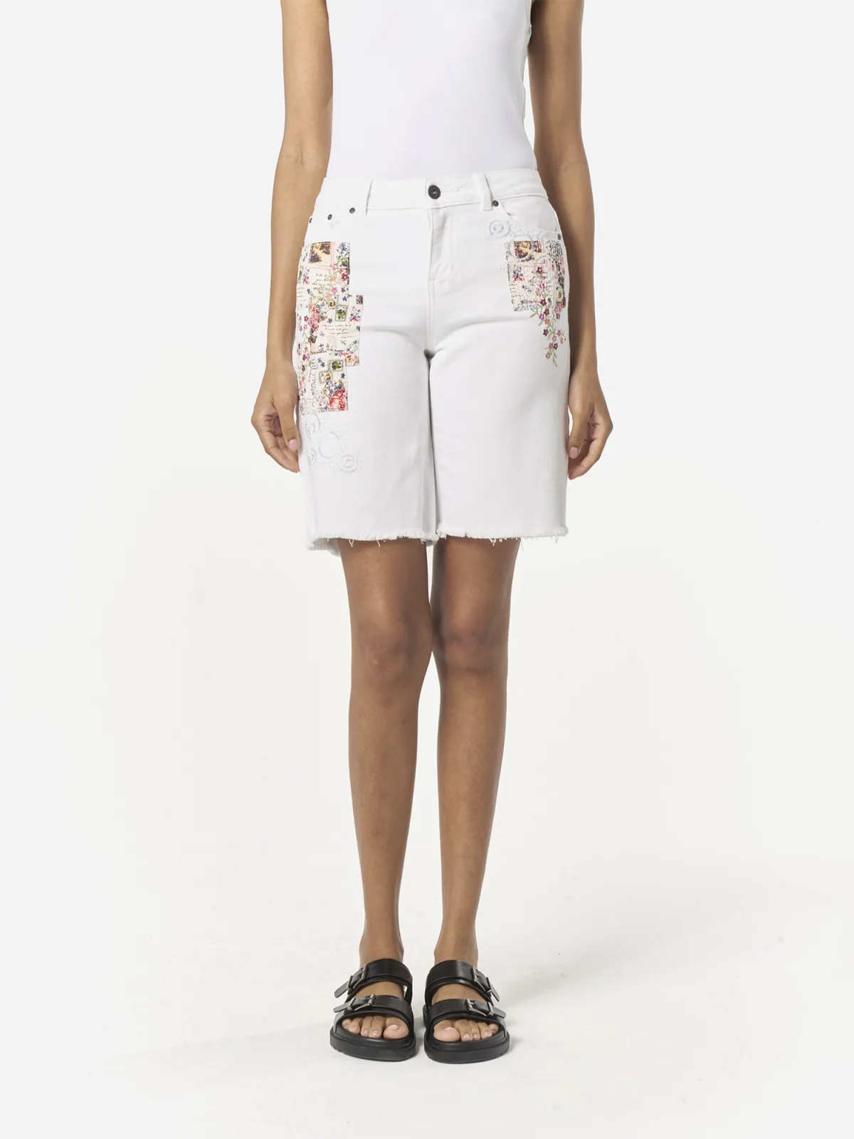 Design: Ritssluiting, 5-pocket-style; Type sluiting: Knoopsluiting; Materiaal: Denim; Details: Borduursels; Extra's: Label patch/label flag, Riemlussen; Wassing: Colored denim; Lengte: Kort/mini; Pasvorm: Regular; Taillehoogte: Mid waist