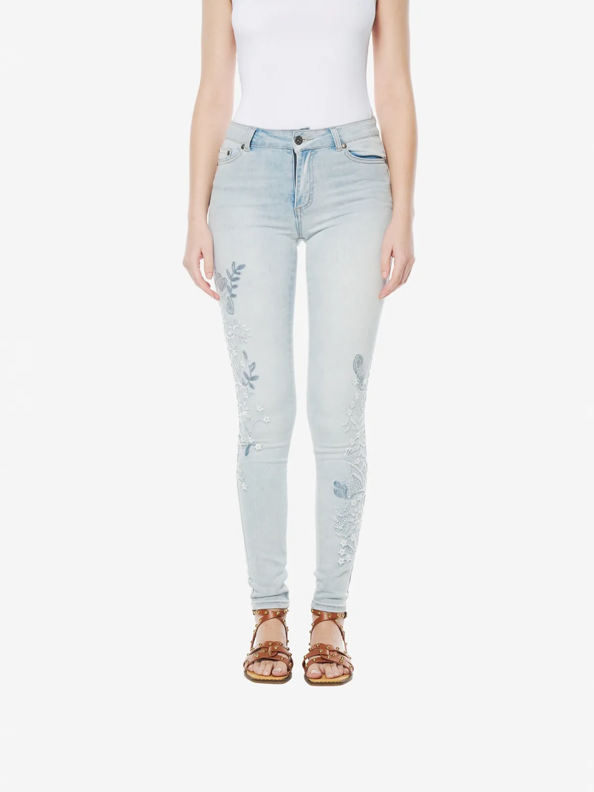 Design: 5-pocket-style, Achterzak, Zakken aan de zijkant; Type sluiting: Ritssluiting; Materiaal: Denim; Motief: Bloemenprint; Details: Borduursels; Extra's: Op staal naden, Riemlussen; Wassing: Heavy washed; Lengte: Lang/maxi; Pasvorm: Slimfit; Taillehoogte: Low waist