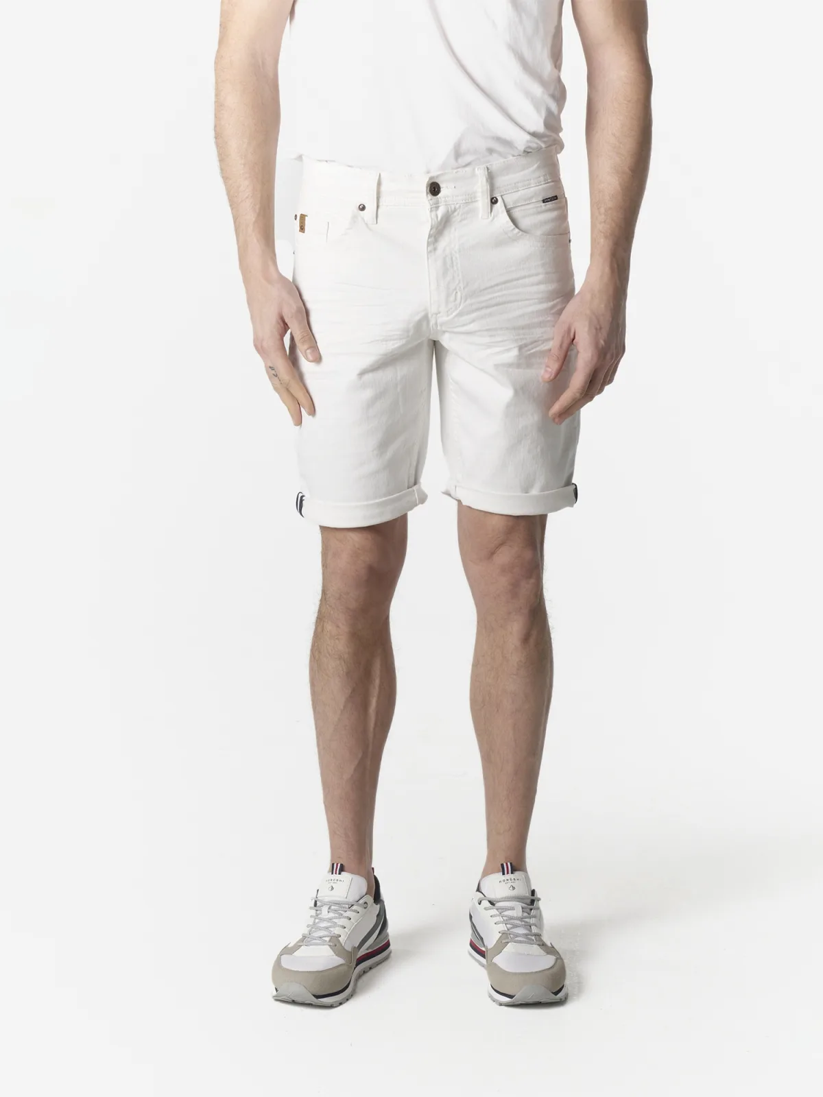 Design: Ritssluiting, 5-pocket-style; Type sluiting: Knoopsluiting; Materiaal: Denim; Motief: Effen; Extra's: Op staal naden, Riemlussen; Wassing: Colored denim; Lengte: Kort/mini; Pasvorm: Regular