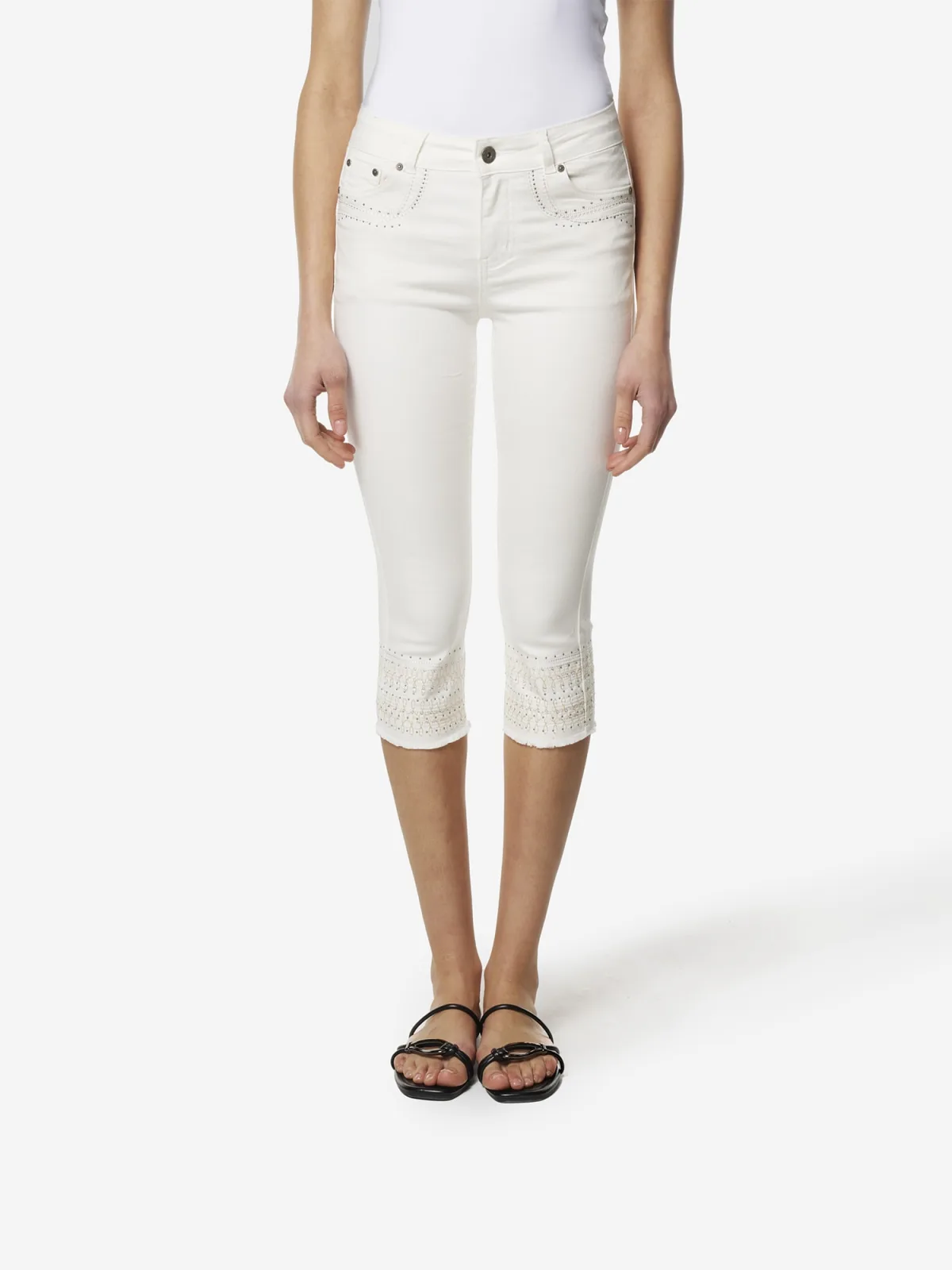 Design: Ritssluiting, 5-pocket-style; Type sluiting: Ritssluiting; Materiaal: Denim; Motief: Effen; Details: Borduursels; Extra's: Studs, Riemlussen; Wassing: Colored denim; Lengte: 3/4 lengte; Pasvorm: Slimfit; Taillehoogte: Mid waist