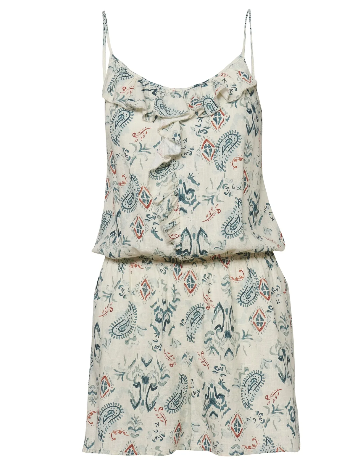 Design: Gevoerde zoom/rand; Materiaal: Viscose; Halstype: Ronde hals; Soort bandjes: Spaghettibandjes; Details: Ruches, Gedrapeerd; Extra's: All-over patroon; Lengte: Kort/mini; Pasvorm: Normale pasvorm; Armlengte: Mouwloos