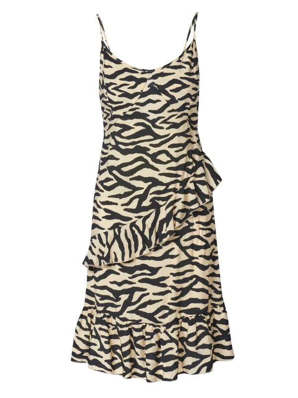 Design: Gevoerde zoom/rand; Halstype: Ronde hals; Motief: Dierenprint; Soort bandjes: Spaghettibandjes; Details: Volant, Gedrapeerd; Extra's: Lichte stof; Lengte: Knielengte; Pasvorm: Normale pasvorm; Armlengte: Kwartmouw